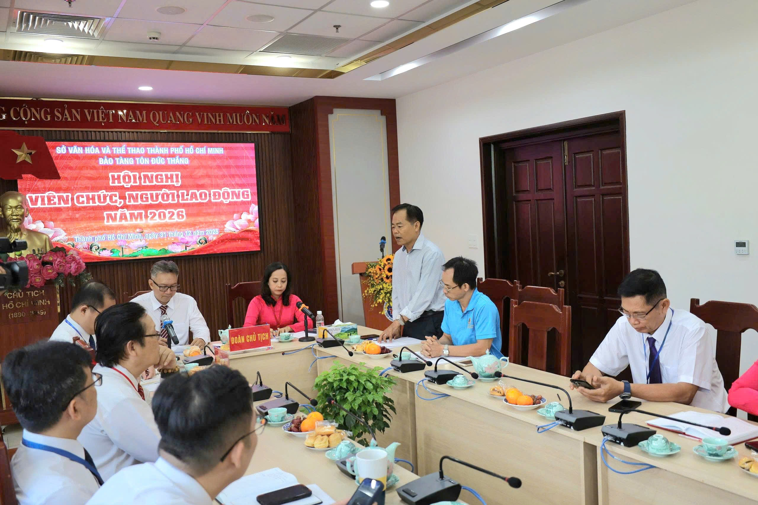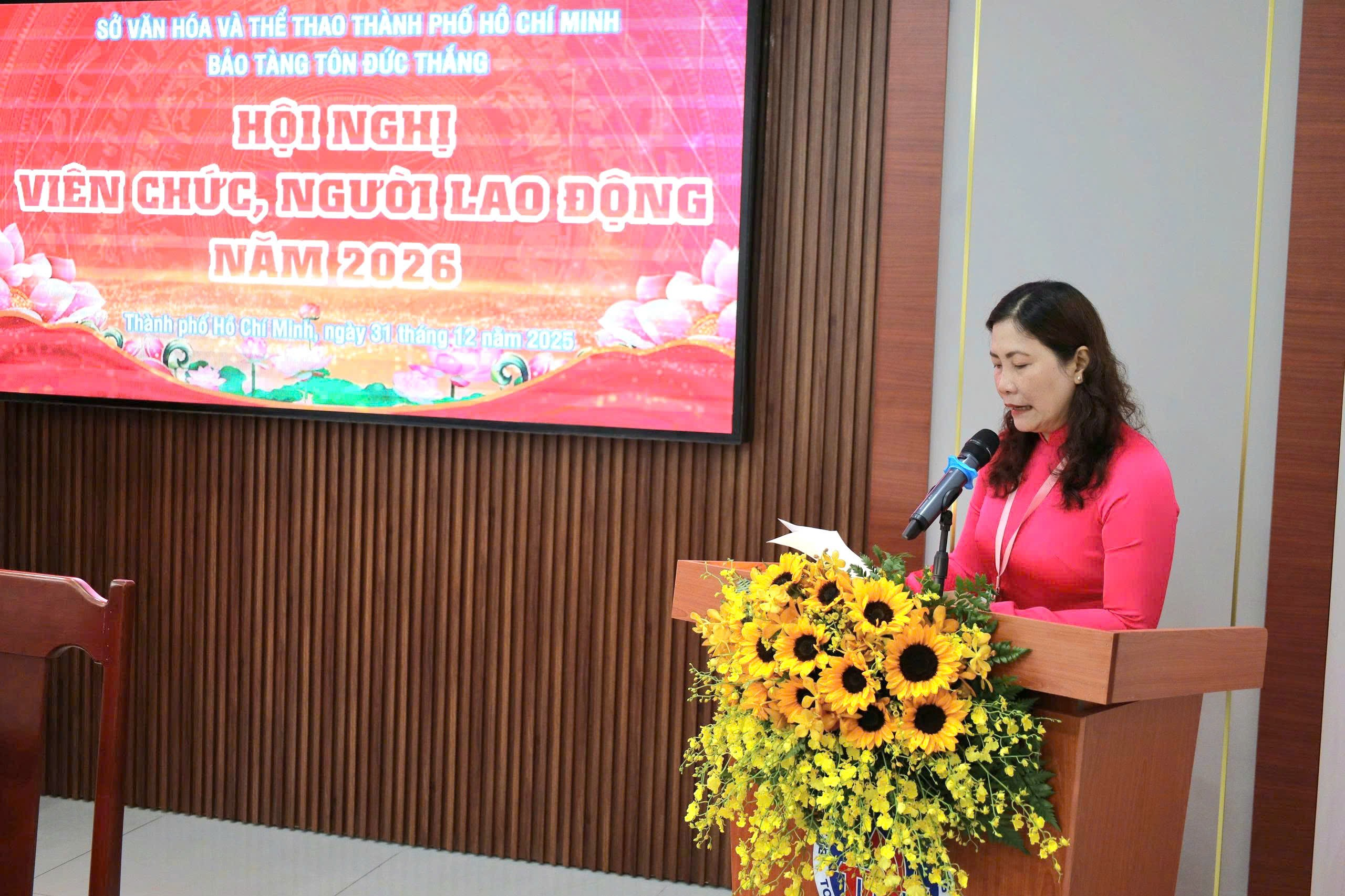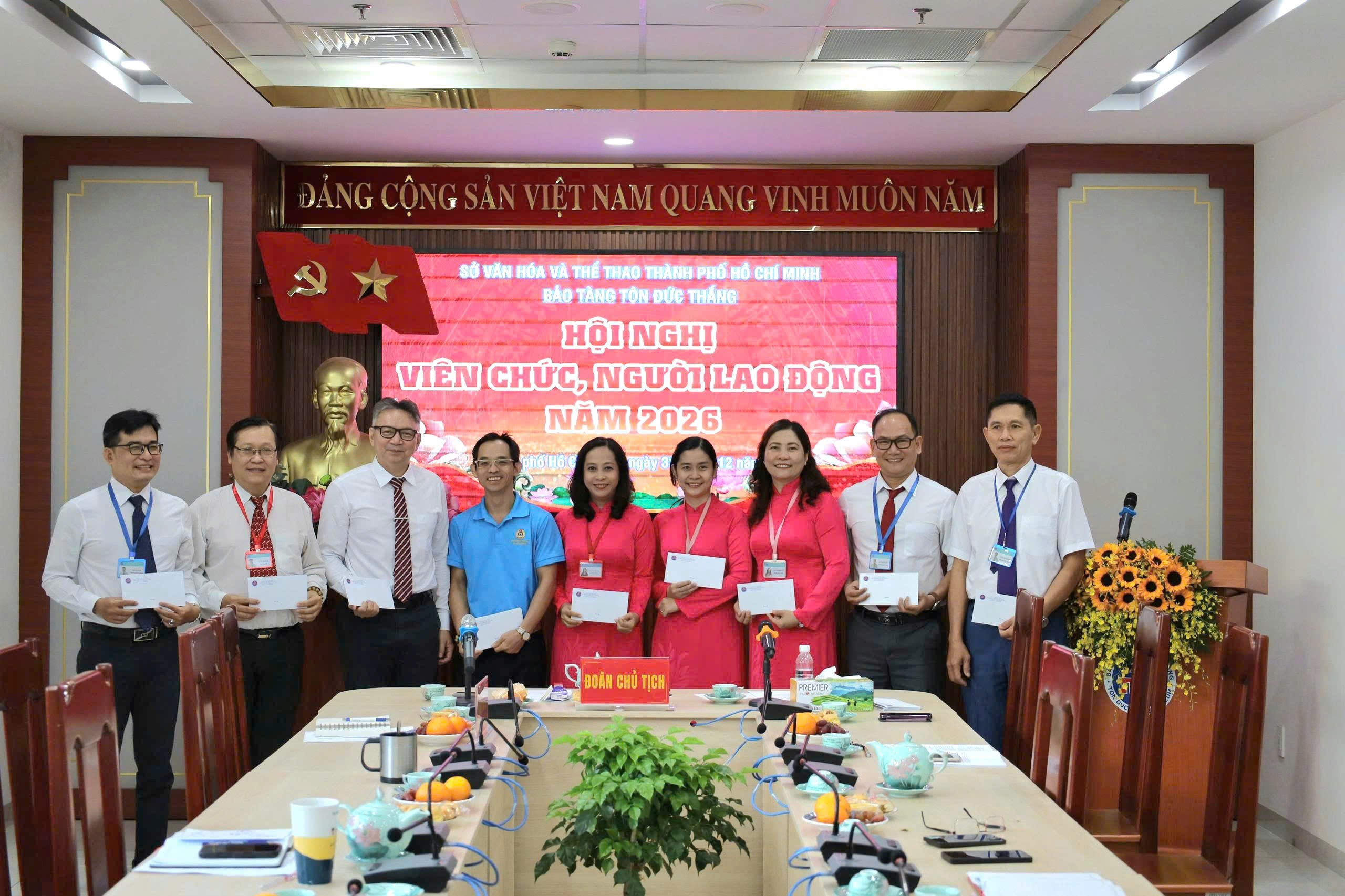 Thực hiện các quy định của pháp luật về thực hiện dân chủ ở cơ sở, theo công văn số 3702/LĐLĐ ngày 21 tháng 10 năm 2025 của Liên đoàn Lao động Thành phố Hồ Chí Minh về việc thực hiện dân chủ ở cơ sở; Công văn số 25/CĐS ngày 25 tháng 10 năm 2025 của của Công đoàn Cơ sở Sở Văn hóa và Thể thao Thành phố Hồ Chí Minh về việc tổ chức Hội nghị cán bộ, viên chức năm 2026. Sáng ngày 31 tháng 12 năm 2025, Giám đốc Bảo tàng Tôn Đức Thắng phối hợp với Ban Chấp hành Công đoàn Cơ sở thành viên Bảo tàng Tôn Đức Thắng tổ chức Hội nghị viên chức, người lao động năm 2026.